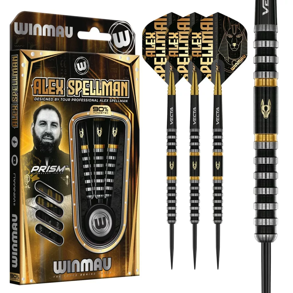 Fekete és arany Vecta szárral és csillogó aranyfóliás, egyiptomi Anubis témájú repülővel párosítva ez a szett Spellman könyörtelen pontosságát és összetéveszthetetlen stílusát testesíti meg. Azok számára, akik azt követelik, hogy dartjaik ugyanolyan élesek legyenek, mint teljesítményük, az Alex Spellman Signature Series 1 a tökéletes fegyver.