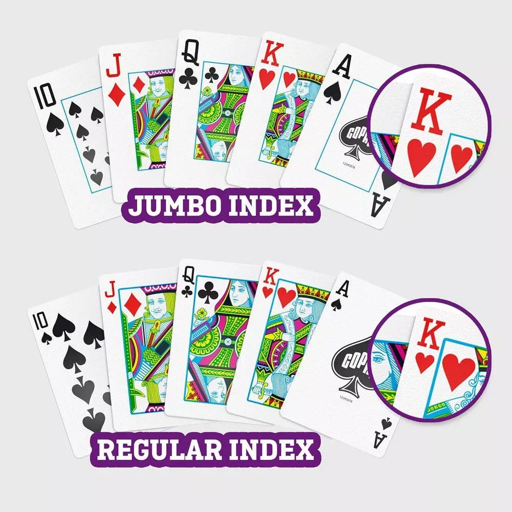 KÁRTYA TÍPUS: Ez a termék két 52 lapos paklit tartalmaz, 2 jokert és egy garanciakártyát. A paklik póker méretűek, amelyek mérete 3 7/16” x 2 1/2” (kb. 8,7 cm x 6,3 cm), ami „széles” méretnek számít. A betűméret jumbo, így a kártyák könnyebben olvashatók. Minden betű és szimbólum körülbelül 1/2” (1,27 cm) hosszú.