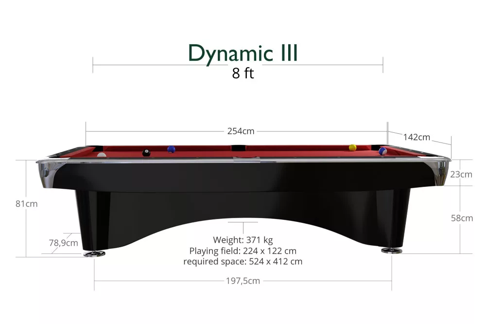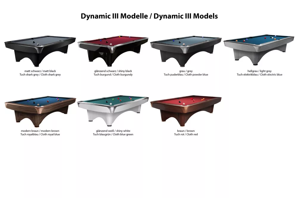 Tetszetős, modern dizájnjával a Dynamic III biliárdasztal tökéletesen illeszkedik játéktermekbe és privát biliárdszobákba is.