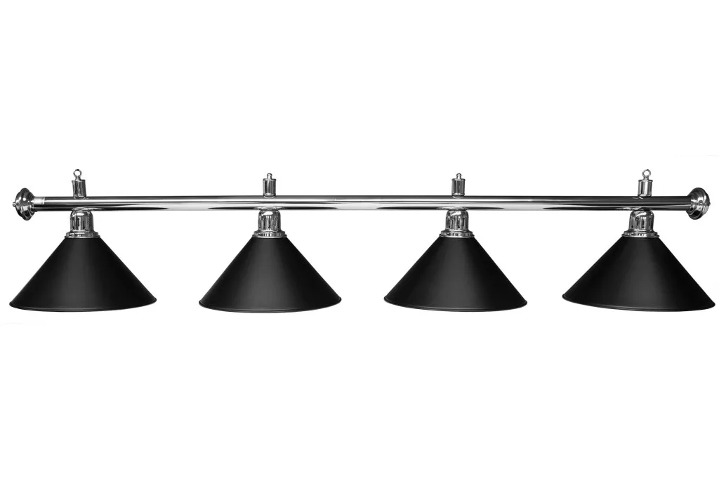 Ez a kiváló minőségű fekete és ezüst színű biliárdlámpa fehér belső bevonattal rendelkezik a fény optimális visszaverődése érdekében. A lámpaernyők tölcséres formája biztosítja az asztal tökéletes megvilágítását, így minden mozdulatot pontosan követhet. A lámpa könnyen összeszerelhető és extra hosszú lánccal rendelkezik, így magas helyiségekben is könnyen összeszerelhető. Alacsony helyiségekben a lánc lerövidíthető.