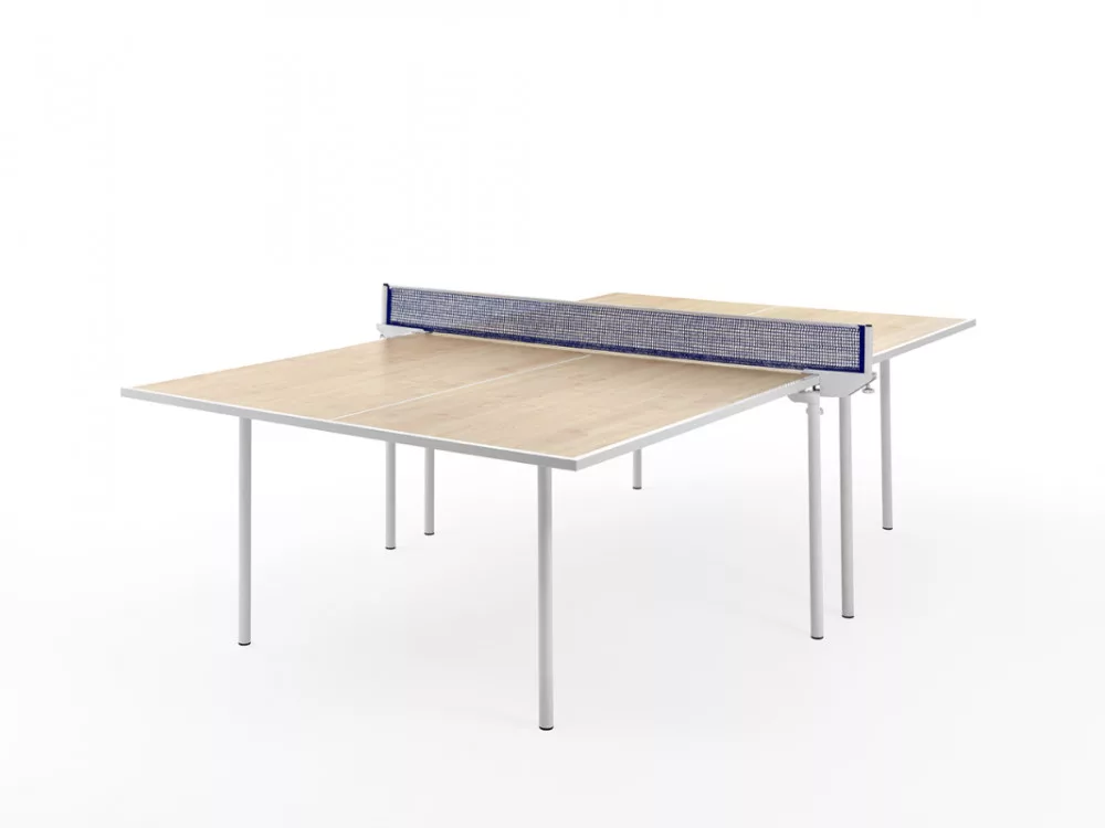 The ping-pong table is separated into 2 sturdy tables that can be easily stored on top of each other thanks to the turned metal legs.