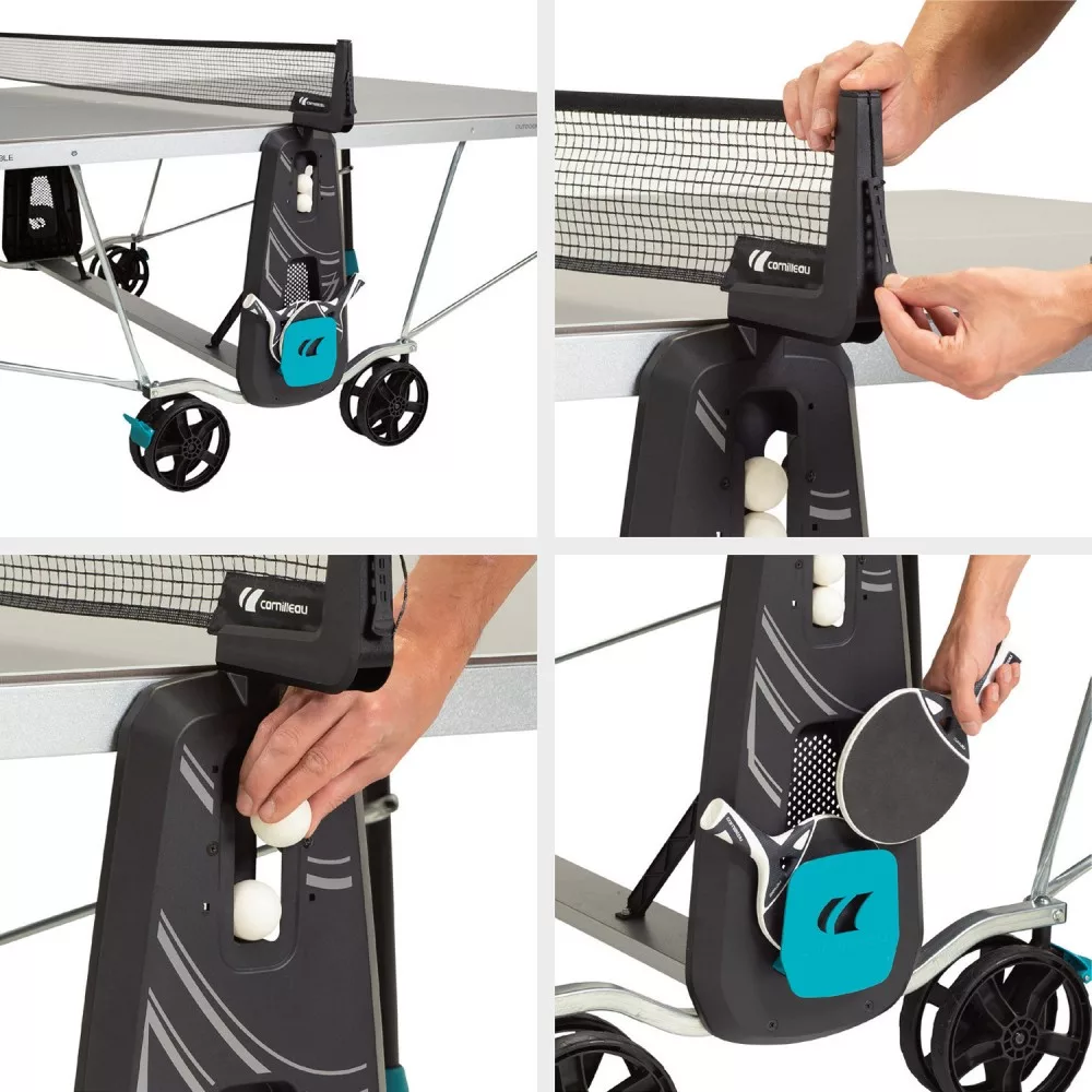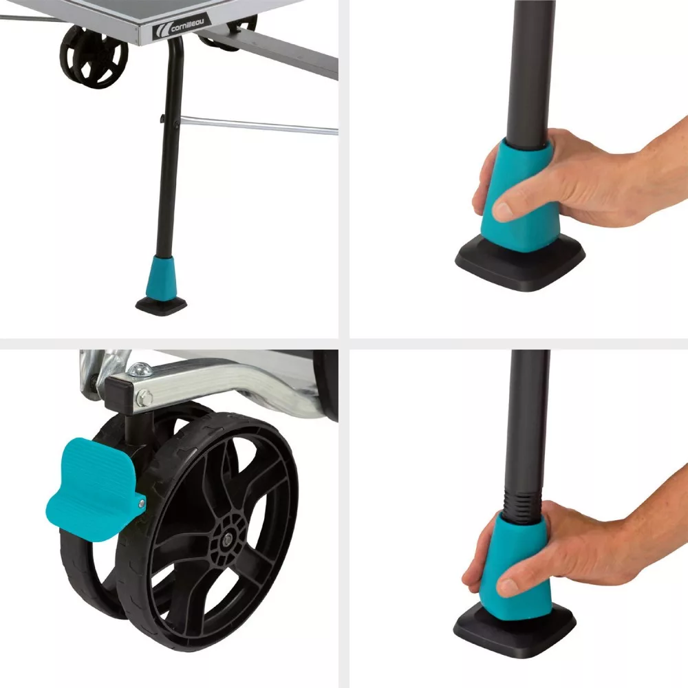 With extra-large double wheels, you can easily move the Cornilleau 300X outdoor table tennis table even over obstacles and rough terrain.