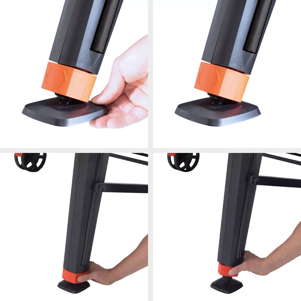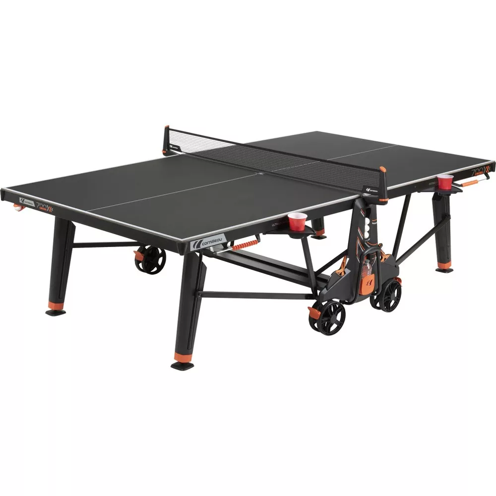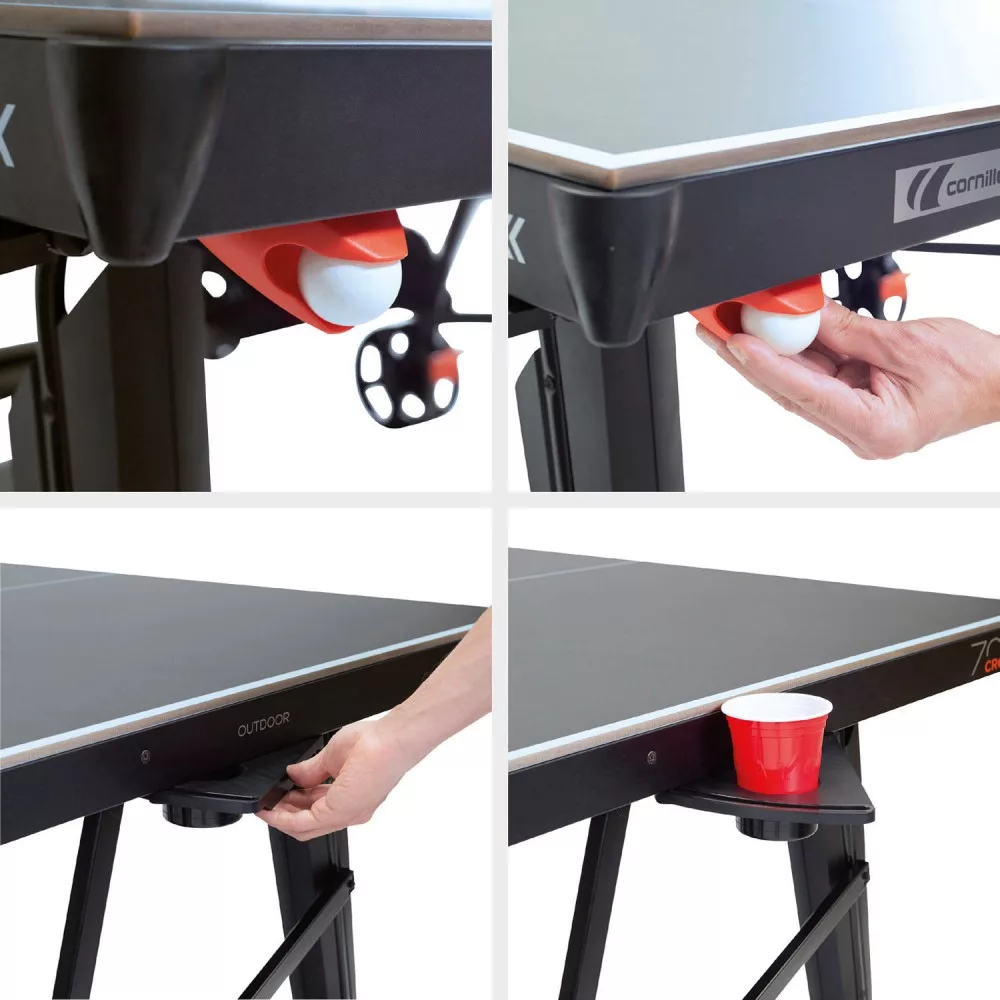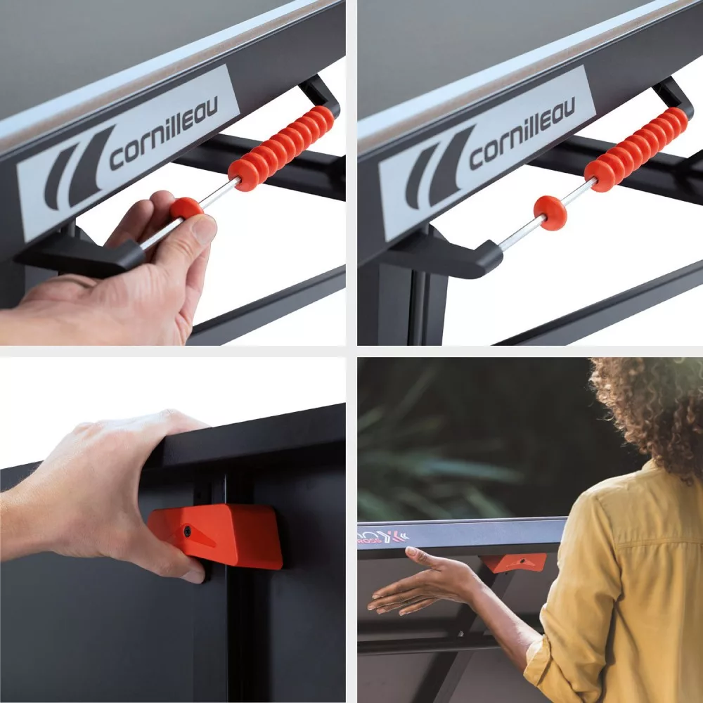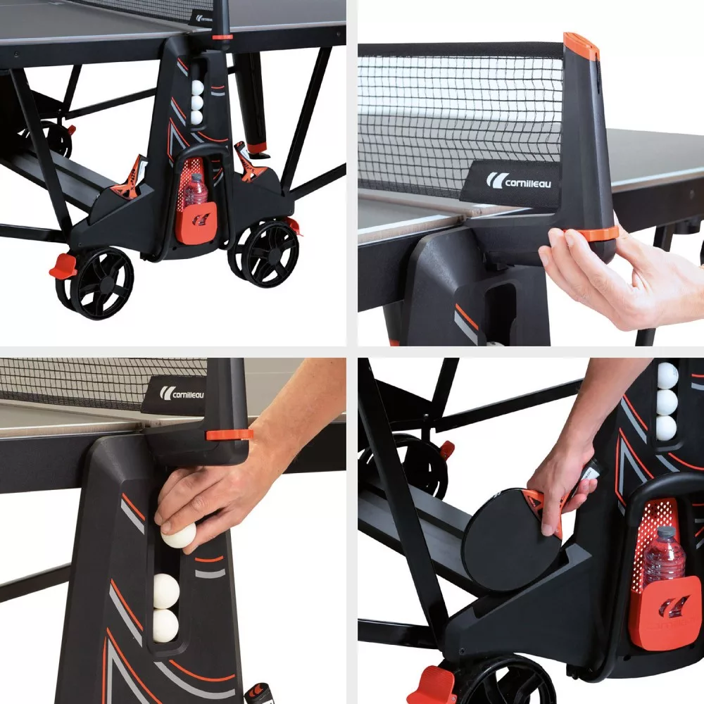 With its bold lines, black playing surface, orange trim and extensive features, the Cornilleau 700X outdoor table tennis table is a striking table