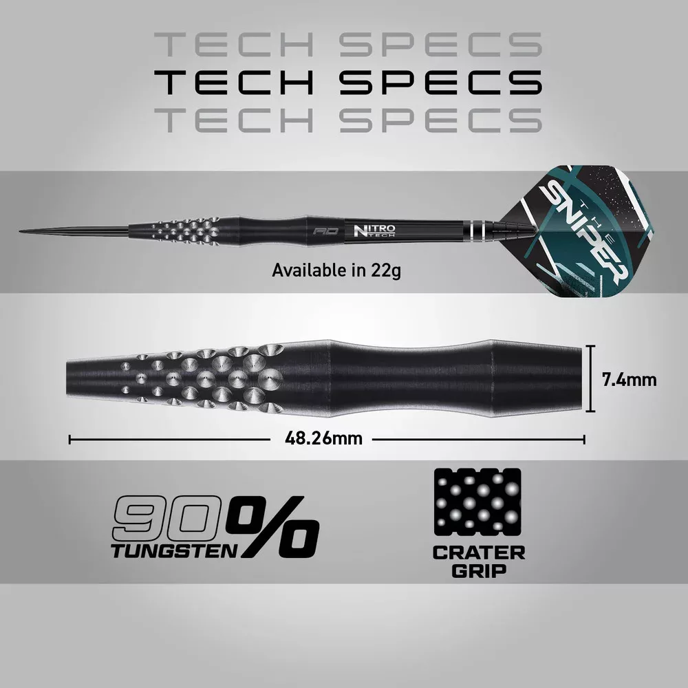 Connor „The Sniper” Scutt dartsai a pontosságra lettek tervezve. 90% wolframból készült, a henger közepén található bordázás természetes fogást és könnyed elengedést biztosít, míg a merész ezüst kráterfogás kontrollt és stílust ad.