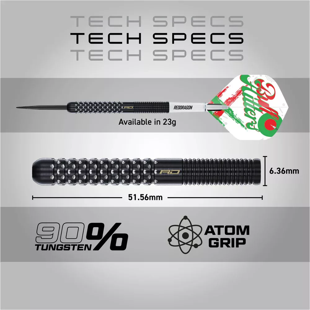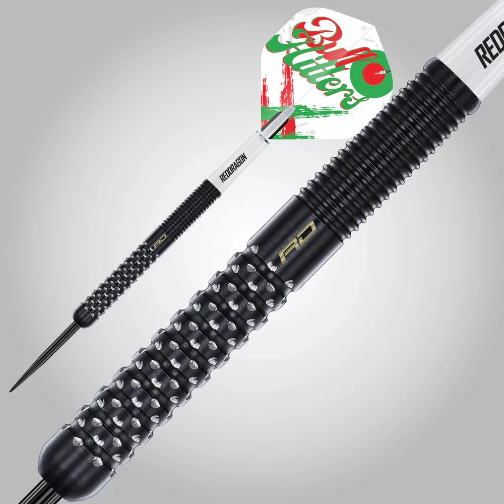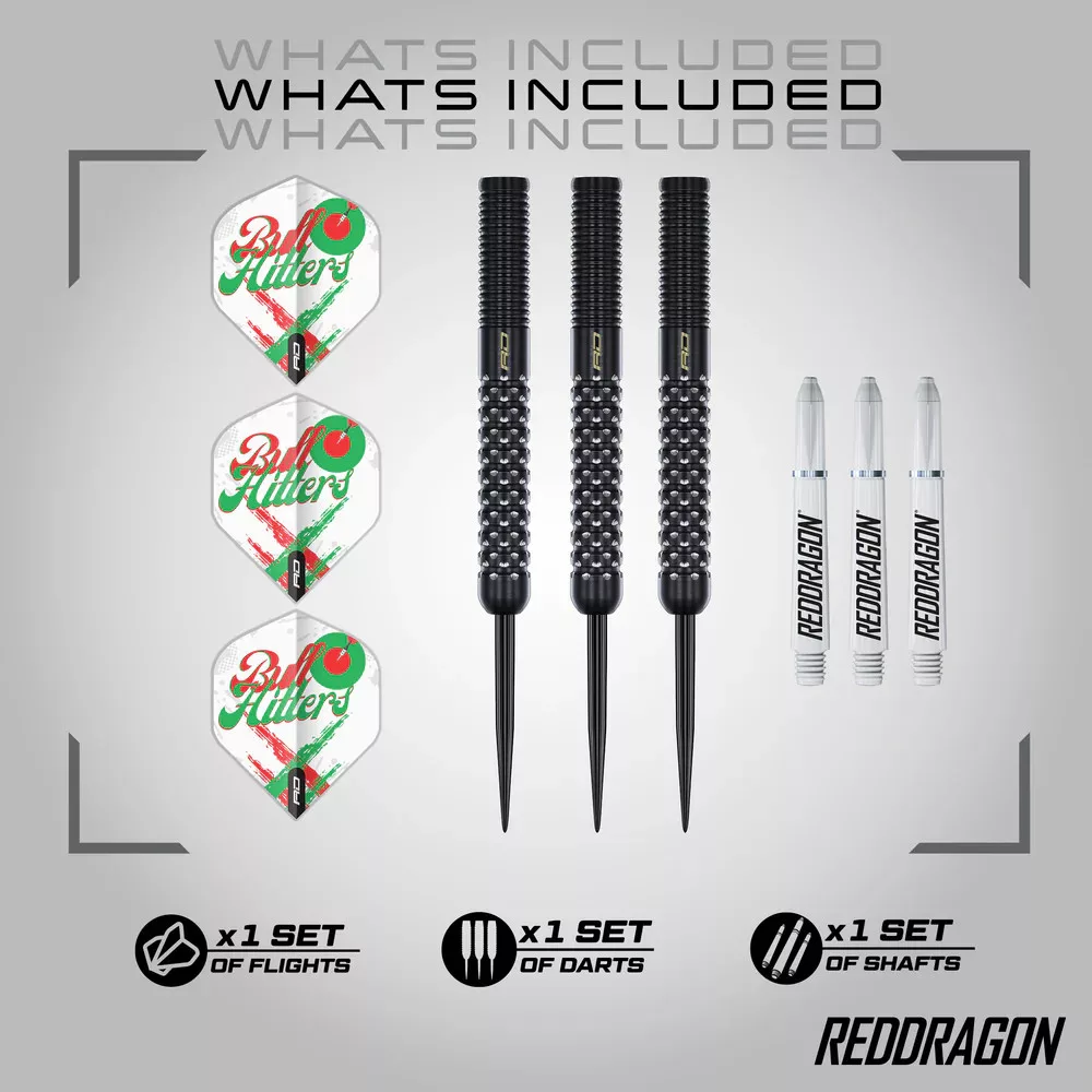 Minden darts testének középpontjában egy 90%-ban volfrámból készült mag található, amelyet a Red Dragon jellegzetes precizitásával alakítottak ki. Az elülső Atom markolat határozott tapadást biztosít a robbanásszerű indításhoz, míg a finoman megmunkált hátsó gyűrűs markolat finomságot és stabilitást garantál a dobás során. A Bullhitters V1 elegáns fekete PVD bevonattal van ellátva, így nemcsak a reflektorfényben tündököl, hanem a mérkőzések és a tartalomkészítés kemény igénybevételeinek is ellenáll.
