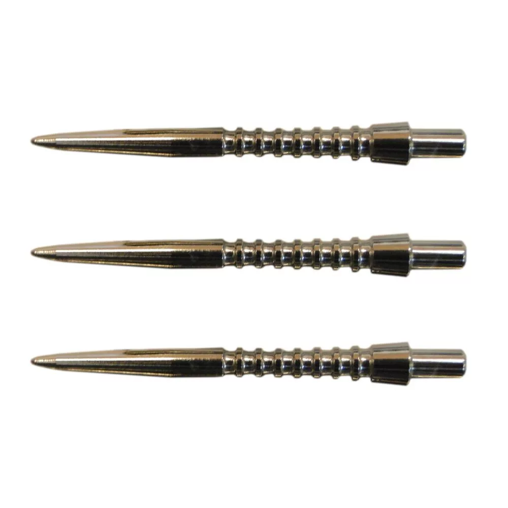 30 mm long, silver, silver, silver-coloured, silver-coloured, metallic tip for steel darts Thanks to the special design, which widens in front of the body, the game is more effective (less arrows are deflected on the nib already in the board) and the nibs are less damaged. (Can be replaced with a special tool.In the Pole it is possible to replace the metal tip, which takes 10-15 minutes, so you can wait!)