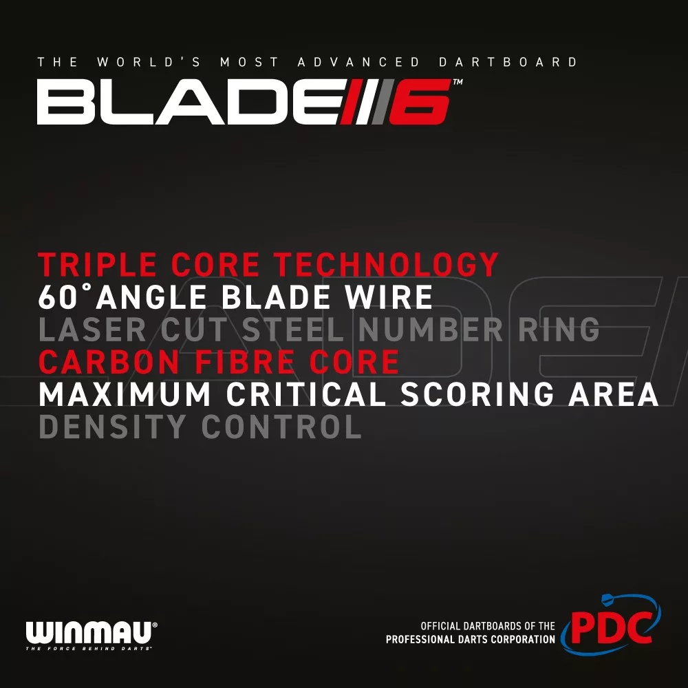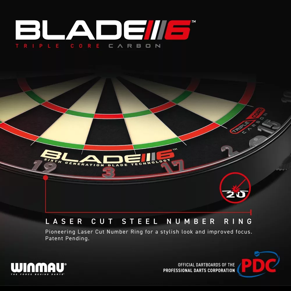 The Blade 6 Triple Core is a giant leap forward in dartboard design, the Blade 6 Triple Core is a hallmark of Winmau's 75-year heritage.The latest addition to the Blade series offers stunning design, innovation and craftsmanship, featuring Winmau's latest sixth generation technology.