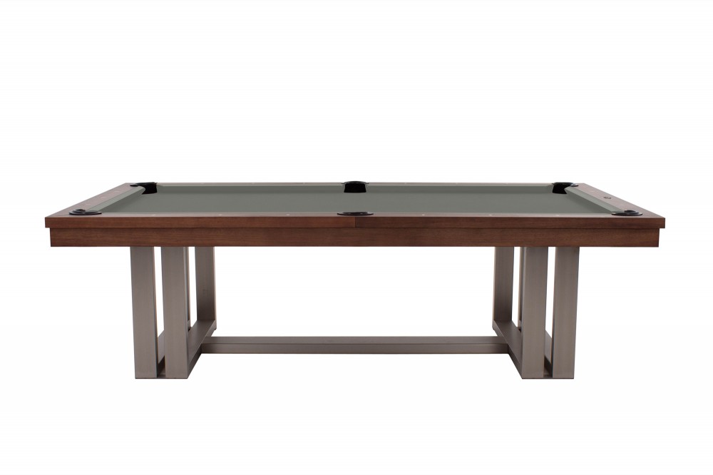 A biliárdasztal tömör fenyőfából készült, dió furnérral. Rendkívül masszív, egymást keresztező, szálcsiszolt rozsdamentes acél lábakkal rendelkezik a stabilitás és az egyedi megjelenés érdekében.