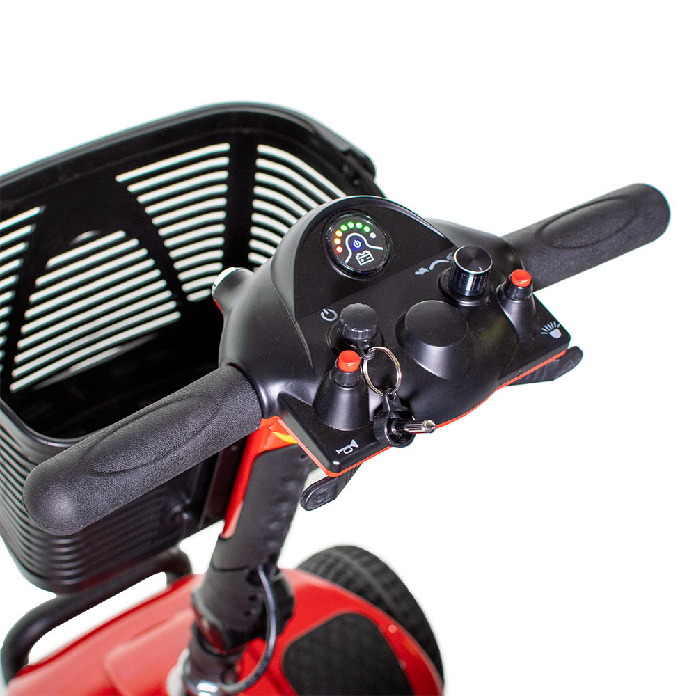 -kezelőszervek: sebesség beállítás, akkumulátor töltöttségi szint jelző, biztonsági duda, első világítás