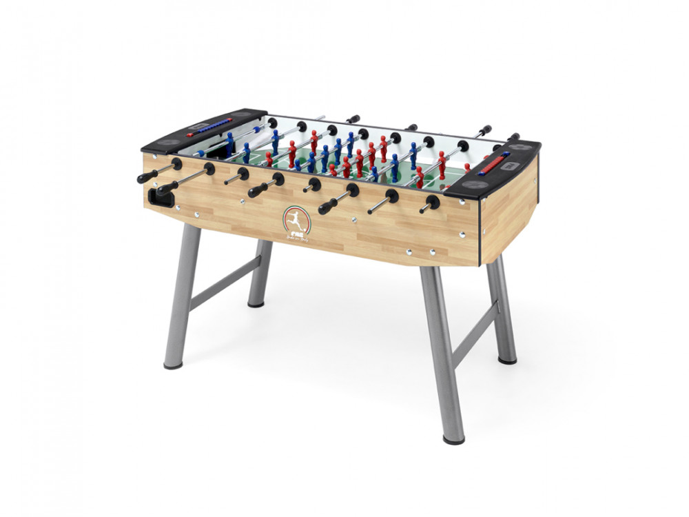 Strapabíró, nyitott, érmevizsgáló nélküli tradícionális olasz csocsóasztal.
